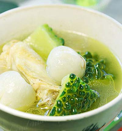 Khi thấy gà đã mềm, lần lượt cho mướp đắng, vải thiều vào, hầm thêm chừng 2 - 3 phút nữa. Sau đó nêm gia vị cho vừa miệng.