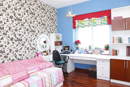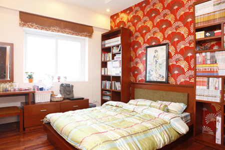 ![]() Phòng ngủ của Trang, nơi thể hiện cá tính và sở thích riêng của cô: những họa tiết trên giấy dán tường, bức tranh cô gái Nhật và 2 "kho báu" ăm ắp truyện tranh, trong đó có không ít những cuốn truyện tranh Nhật Bản. |