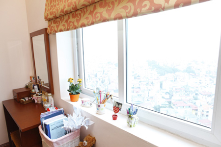 Một điều khiến Trang vô cùng thích thú khi ở trong căn hộ của mình đó là những ô cửa kính lớn. Từ phòng bếp tới bàn học, bàn trang điểm của Trang đều được đặt cạnh những “khung trời mơ mộng” mà từ đó Trang có thể vừa làm, vừa thư giãn, vừa thả tầm mắt của mình và mặc sức tưởng tưởng, nhìn ngắm.