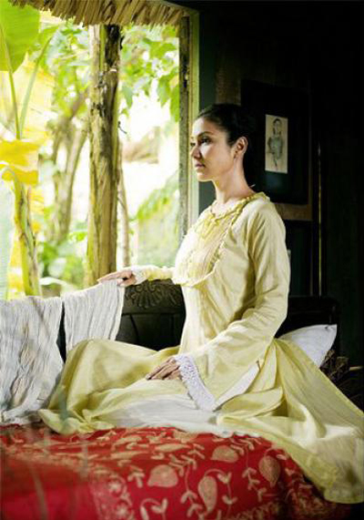 Trong tà áo dài mềm mại, Việt Trinh đẹp dịu dàng, đằm thắm. Thời gian dường như không thể chạm được đến sắc vóc của ngôi sao màn bạc một thời...