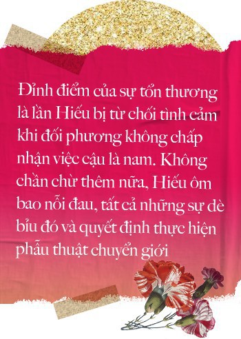 Chưa dừng lại ở đây, đỉnh điểm của sự tổn thương là lần Hiếu bị từ chối tình cảm khi đối phương không chấp nhận việc cậu là con trai. Vậy là không chần chừ thêm nữa, Hiếu ôm bao nỗi đau, tất cả những sự dè bỉu đó và quyết định thực hiện phẫu thuật chuyển giới.