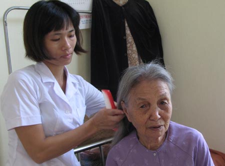 Nhân viên đang chăm sóc cụ già tại một trung tâm bảo trợ xã hội.