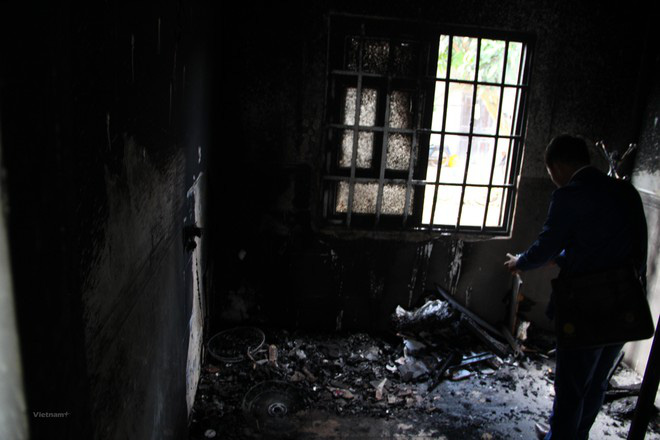 Tại hiện trường, một căn phòng ngủ rộng 9 m2 bị cháy đen, toàn bộ vật dụng trong căn phòng bị thiêu rụi hoàn toàn.