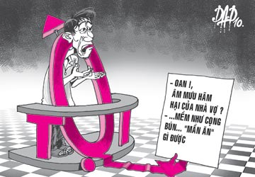 Bị cáo phản cung cho là gia đình vợ âm mưu hãm hại mình. Lúc đầu T. khai nhận là để được ở tù nhằm trả thù vợ. T. muốn một mình vợ làm kiếm tiền trả nợ cho… bõ ghét!