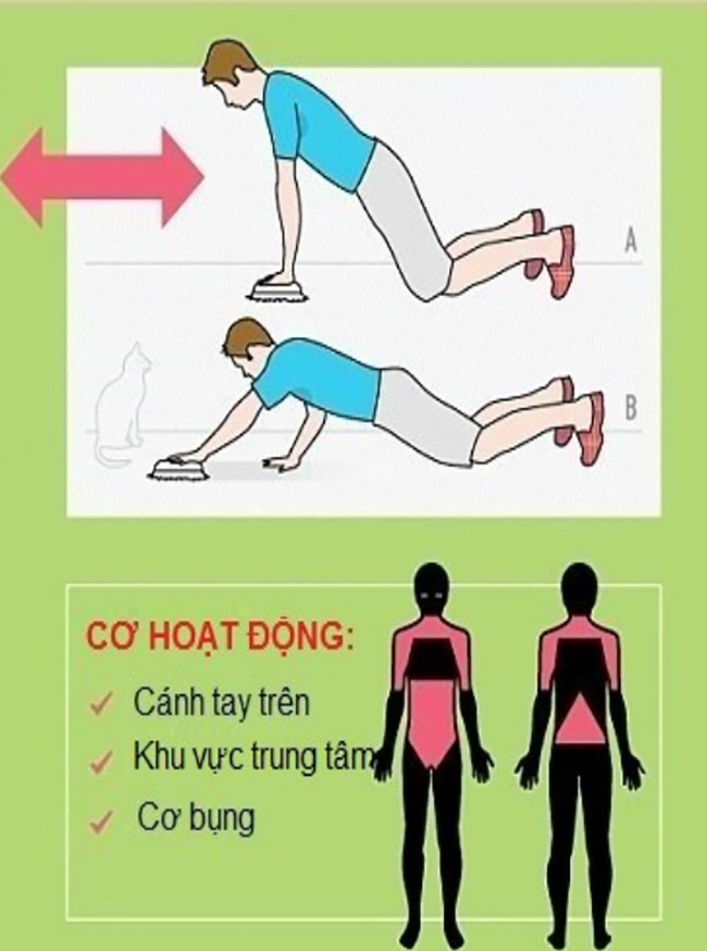 Lau nhà bằng tay tạo ra nhiều lực tác động ở cánh tay và nhóm cơ bụng do đứng lên ngồi xuống liên tục. Những động tác này sẽ tích cực đốt cháy mỡ thừa trong cơ thể, nhất là ở vùng bụng.