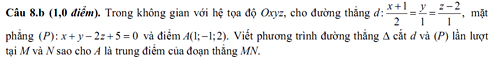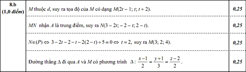 Câu lạc bộ Gia sư thủ khoa cũng đồng tình với ý kiến trên. Theo các thủ khoa, để viết được một phương trình đường thẳng cần biết vecto chỉ phương và 1 điểm thuộc đường thẳng đó. Trong bài 8b này vecto chỉ phương thì đã biết, tuy nhiên có đến 3 điểm M,N,A cũng thuộc đường thẳng cần tìm nên thí sinh dùng điểm nào cũng được, đều cho ra kết quả chính xác.