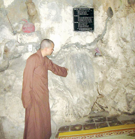 Đại đức Thích Nguyên Thanh đang chỉ vào bài thơ cổ khắc trên đá. |