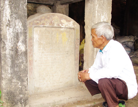 Cụ Vũ Hồng bên cạnh tấm bia cổ - dấu tích duy nhất của đình Vật còn sót lại. |