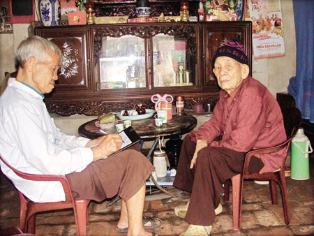 Hai cụ Nguyễn Đình Phương và cụ Vũ Hồng đang kể lại nguồn gốc đình Vật. |