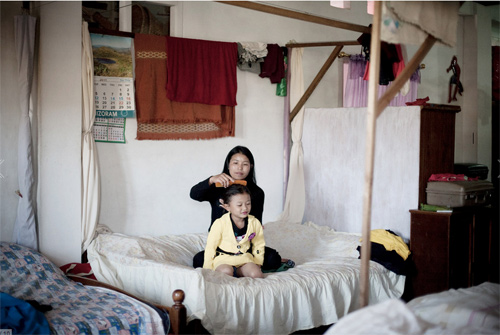 Chị Siami (32 tuổi) đang chăm sóc cho con gái nhỏ 6 tuổi trong phòng ngủ chung của các bà vợ.