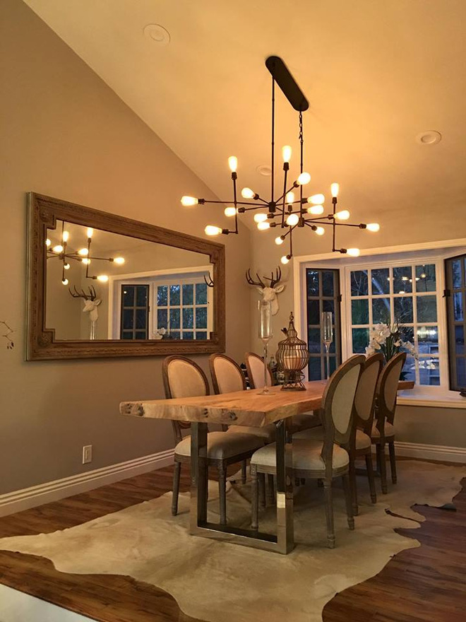 Phòng ăn cổ điển với ghế và bàn gỗ nhưng lại được chấm phá nét hiện đại với chiếc đèn treo.