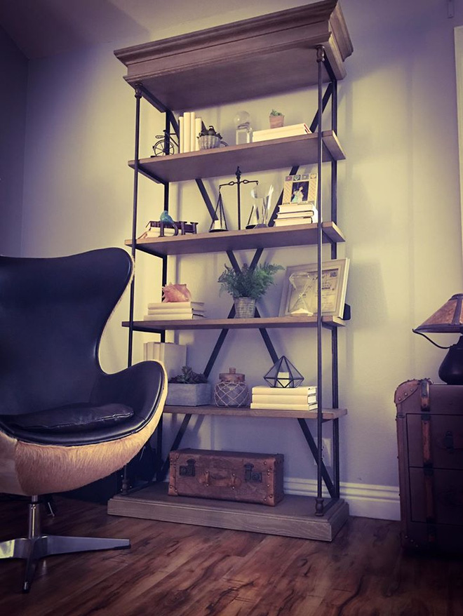 Giá sách và kệ để đồ lưu niệm đều rất đơn giản được làm từ gỗ và kim loại.