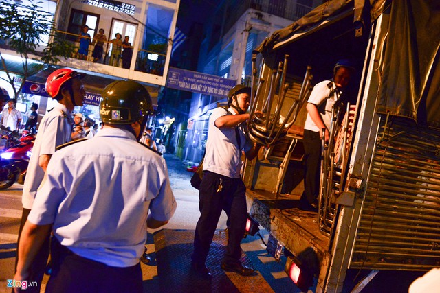 Lực lượng đoàn kiểm tra đã thu nhiều bàn ghế các quán ăn lấn chiếm vỉa hè trong tối 7/8. Các vật dụng này sẽ được trả lại cho người dân sau khi hộ kinh doanh vi phạm lên UBND quận đóng phạt.