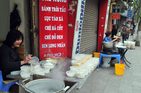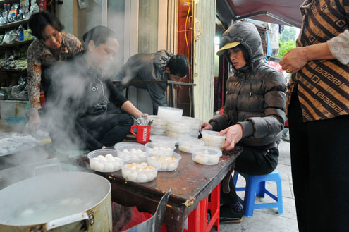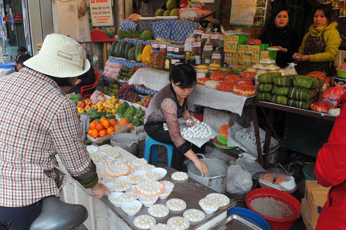 ![]() Các hàng bán xôi, giò, bánh chưng ở chợ Hôm hôm nay cũng kiêm thêm bán món này. |