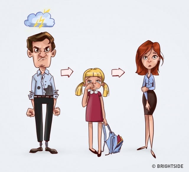 Bạn đang ăn sáng cùng gia đình thì con gái bạn vô tình làm đổ cà phê lên chiếc áo sơ mi của bạn. Bạn nhảy dựng lên và hét vào mặt con gái, sau đó trách móc vợ bạn đã đặt cốc cà phê quá gần mép bàn. Bạn vội vã vào phòng thay áo, nhưng khi bạn đi ra, bạn thấy con gái đang khóc lóc vì chưa ăn xong bữa sáng, và cũng chưa sẵn sàng cặp sách để đến trường.