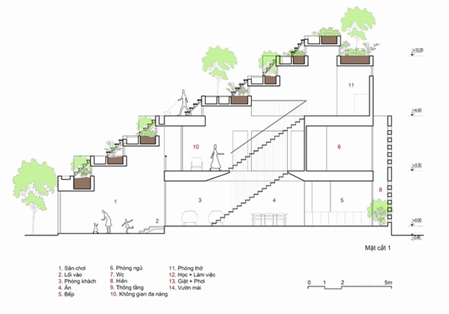 Tạo hình bậc thang khiến cho ranh giới trong-ngoài, trên-dưới bị xóa nhòa. Nhìn từ bên ngoài, bạn không thấy sự tách biệt giữa các tầng mà chỉ cảm nhận được một khối liền mạch.