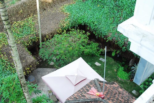 Chủ nhân của ngôi nhà vườn ở triền đê sông Hồng - anh Khoa, vốn là dân mỹ thuật nên đã tự tay thiết kế hầu hết các chi tiết kiến trúc trong căn nhà. Nhờ có con mắt thẩm mỹ của dân mỹ thuật cùng sự tư vấn của bạn bè là dân trong ngành, căn nhà có nét sang trọng, lịch lãm mà vẫn riêng không lẫn ở đâu khác. Một gốc cây thế to lừng lững tỏa bóng mát cả một góc sân.