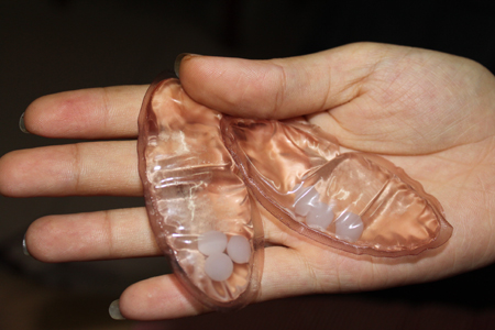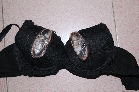 Túi dịch lỏng và 3 hạt màu trắng ở trong áo nịt ngực. Ảnh: H.My |