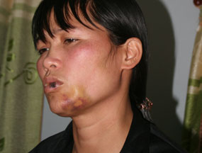Bà Nguyễn Thị Thủy với đầy thương tích trên mặt. |