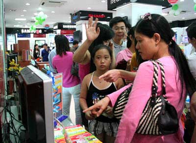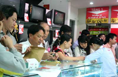 Cận giờ mở cửa (9 giờ sáng), một loạt siêu thị điện máy khu vực quận Hoàn Kiếm, gần Hồ Gươm, người như nêm, xếp hàng từ sát cửa ra vào tới rìa đường, đông nghẹt. Panô, biển quảng cáo sặc sỡ, bắt mắt về chương trình khuyến mại, giờ vàng mua sắm treo dán khắp nơi.