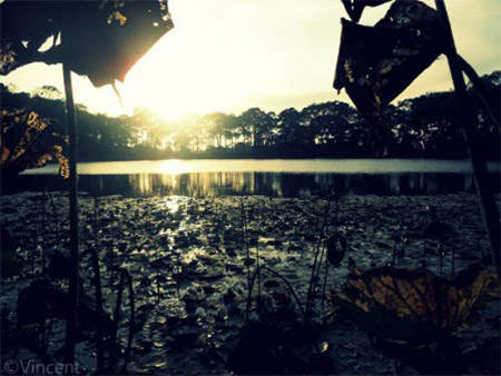 Ao Bà Om trong nắng chiều. Với hình dáng khá vuông nên còn gọi là ao Vuông, được phủ bởi hoa sen, hoa súng. |