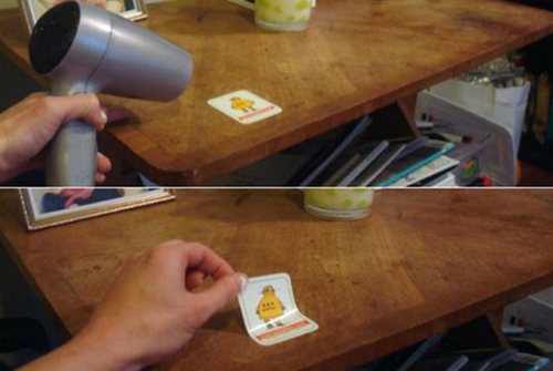 Bật máy sấy tóc hướng về các miếng dán, sticker, bạn sẽ dễ dàng lấy chúng ra mà không sợ bị keo dính còn sót lại.