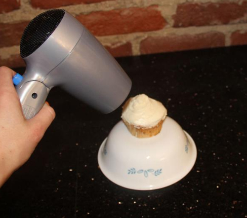 Dùng máy sấy tóc ở nhiệt độ thấp sấy quanh lớp kem trên bánh sẽ khiến lớp kem bóng loáng và ngon mắt hơn.