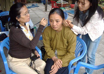 Hoài An hóa trang để vào vai già trong "Câu chuyện pháp đình". |