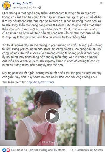 Trên trang Facebook cá nhân, anh Chánh văn viết: "Làm chồng là một nghề nguy hiểm, không có hướng dẫn sử dụng vợ, không có cảnh báo hay giáo trình nào sất. Cưới một người phụ nữ về để họ làm vợ nếu không cẩn thận sẽ biến con cún con bé bỏng thành sư tử Hà Đông". Cách viết dí dỏm, sâu sắc, Hoàng Anh Tú chia sẻ về vai trò của người chồng, cần có sự thấu hiểu, hành động quan tâm, chia sẻ cùng vợ. Anh khuyên, các anh chồng chủ động thể hiện sự quan tâm đến người phụ nữ của mình.
