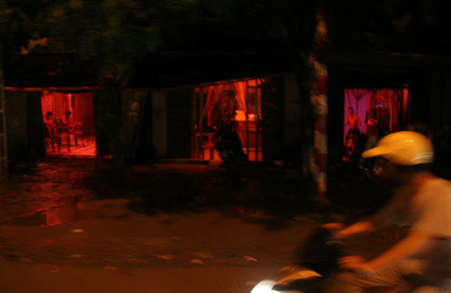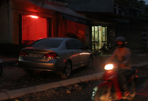 Phố Phan Đăng Lưu (huyện Gia Lâm) dài chừng vài trăm mét nhưng từ nhiều năm nay nổi tiếng là điểm nóng về tệ nạn núp bóng cà phê thư giãn. Gần 19h, khi thành phố lên đèn thì cũng là lúc cả tuyến phố này nhuộm màu đỏ của đèn neon. Dưới ánh sáng nhờ nhờ, các cô gái ăn mặc thiếu vải mặt trát đầy phấn ngồi lả lơi trước cửa quán để chào mời khách. |
