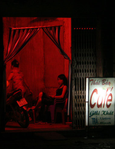 Đêm xuống, cả trăm cô gái ở quán cà phê đèn mờ trên các "phố vẫy" lại diện những bộ trang phục khêu gợi ngồi đợi khách.