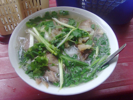 Do là hàng phở vỉa hè nên bát đũa cũng hết sức đơn giản và không có thìa. Khách một tay bưng bát, một tay dùng đũa và khi muốn uống nước thì dùng miệng húp sột soạt. Tiện lợi và vui. Phở ở đây khá ngon và được làm theo kiểu Hà Nội, với thịt bò chín có đủ nạm và gầu, với hành lá chẻ và nhiều hành hoa.