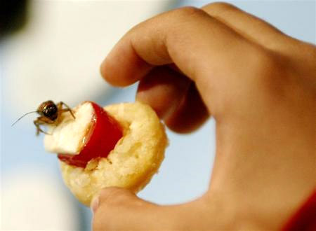 Một cậu bé đang cầm món khai vị có trang trí côn trùng trước khi thưởng thức lúc em đang ở Viện bảo tàng Lịch sử tự nhiên