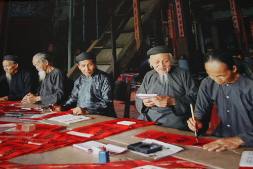 Trong những ngày cuối năm nhộn nhịp không khí đón xuân, Nhà Lớn Long Sơn lại trở thành nơi xin chữ đầu năm. Các bô lão mặc áo the đen, ngồi trên vuông chiếu viết đối liễn bằng nét chữ mực nho đen nhánh trên nền giấy hồng điều đã truyền từ đời này sang đời khác.