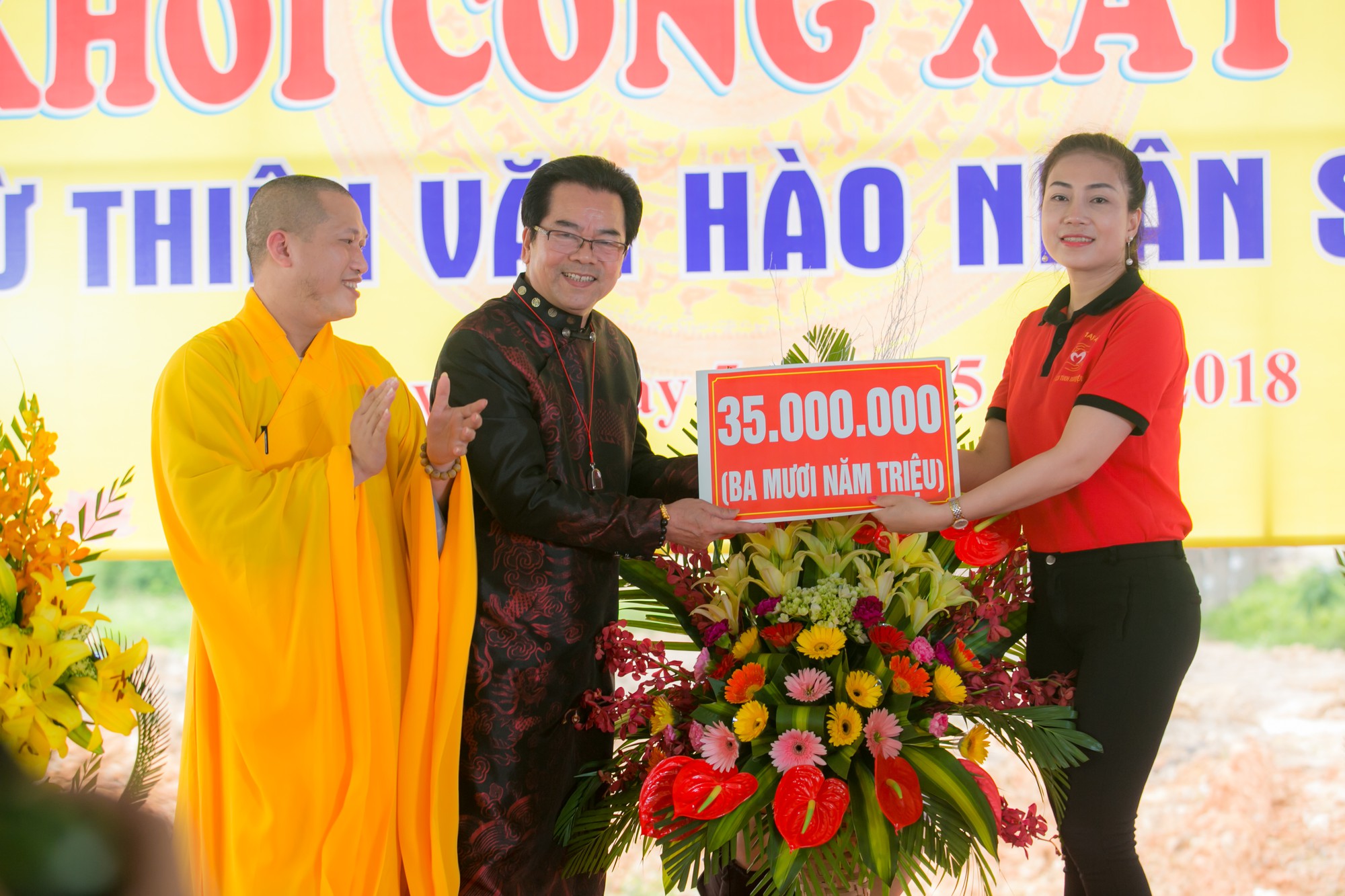 Đại đức Thích Nguyên Bình cùng NSND Trần Nhượng đón nhận những tấm long hảo tâm của các mạnh thường quân