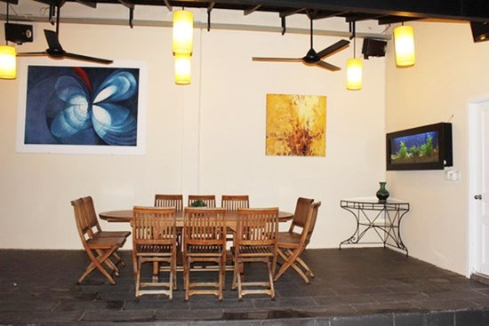 Cạnh hồ bơi, vườn tược còn có một góc vừa đủ để nghỉ ngơi và thưởng thức café. Bộ bàn ghế gỗ cùng vài bức tranh nghệ thuật, qua bàn tay sắp xếp khéo léo của Diễm My, đã trông lãng mạn hơn nhiều.