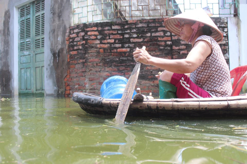 Cảnh ngập nước xảy ra ở Chương Mỹ hàng chục ngày khiến người dân phải bơi thuyền để đi lại sinh hoạt trong làng.