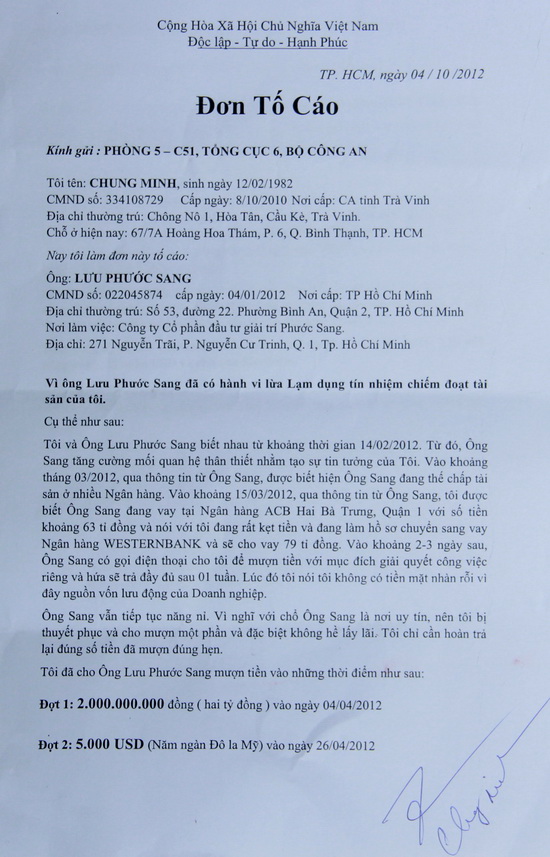 ![]() ![]() Nội dung đơn mà doanh nhân Chung Minh tố cáo "ông bầu" Phước Sang giật nợ |