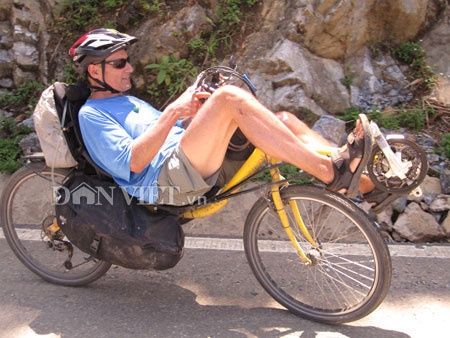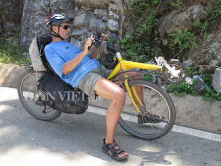 Ông khách Tây gần 50 tuổi đi chiếc xe đạp có cấu trúc khác biệt du lịch từ Hà Nội lên Điện Biên với quãng đường gần 500 km.
