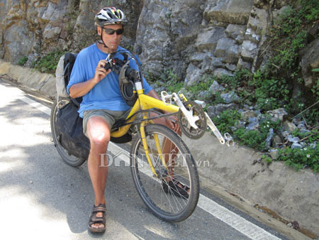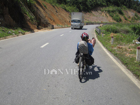 ![]() Ôi! Đã đèo dốc cao lại còn nắng gắt và xe cộ ngược chiều! Mỗi ngày ông đi được hơn 100 km trong tư thế luôn phải ngửa mặt lên trời như thế. |