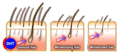 Đối với nam giới, khoảng 95% trường hợp rụng tóc, hói đầu là do sự gia tăng DHT (Dihydrotestosterone). DHT là một hormone nội sinh do Testosterone chuyển hóa thành. Trong cơ thể nam giới, quá trình này thường xuyên diễn ra khiến DHT trở nên dư thừa. DHT dư thừa sẽ tích tụ ở nang tóc làm nang tóc bị bít nghẽn. Hệ quả là nang tóc sẽ không hấp thu được dưỡng chất và bị co rút lại, làm sợi tóc mỏng, yếu dần và rụng.