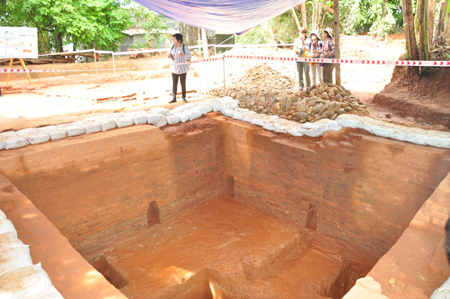 Trước đó, trong lần khai quật giai đoạn 1 vào tháng 4/2011, đoàn khai quật 5 hố với diện tích khoảng 206m2 đã phát hiện được tháp cổng và bắt đầu lộ một phần của tháp chính. Sau đó, đoàn đã tiếp tục khai quật thêm 4 hố khác với diện tích khoảng 300m2.