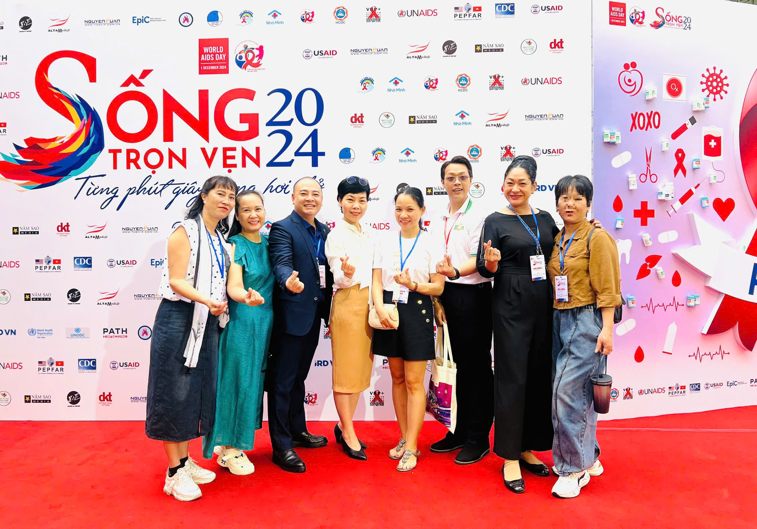 Từ việc trao tờ tài liệu, hướng dẫn uống thuốc ARV, đến những chuyến đi phát thuốc tận nhà, mỗi khoảnh khắc ghi lại nỗ lực bền bỉ, âm thầm nhưng quyết liệt của cộng đồng và câu chuyện của anh Nghĩa, chị Thoa cùng sự gắn kết với SDIC là minh chứng sống cho thông điệp: “HIV không phải là dấu chấm hết, thiếu hiểu biết và định kiến mới là rào cản”. Họ đang chung tay, từng bước hiện thực hóa mục tiêu chấm dứt dịch AIDS tại Việt Nam vào năm 2030, xây dựng cộng đồng sống đầy hy vọng và nhân ái (Ánh chụp chị Thoa (bìa phải) cùng các đại biểu trong sự kiện Hưởng ứng Ngày Thế giới phòng, chống AIDS - Ngày hội “Sống trọn vẹn" 2024).