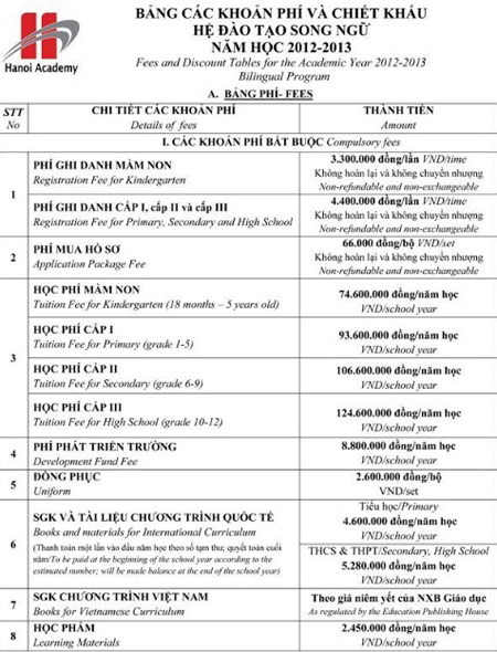 Tại Trường quốc tế Việt Úc, phụ huynh còn phải đóng phí dự tuyển 1.050.000 đồng (tiểu học) và 2,1 triệu đồng (THCS, THPT) rồi phí giữ chỗ 10.500.000 đồng. Trường tiểu học Hà Nội Academy lại có khoản phí đăng ký cho năm học kế tiếp từ 4,5 triệu-7 triệu đồng tùy cấp học, rồi phí mua hồ sơ, phí ghi danh cũng từ vài trăm tới vài triệu đồng/lần.