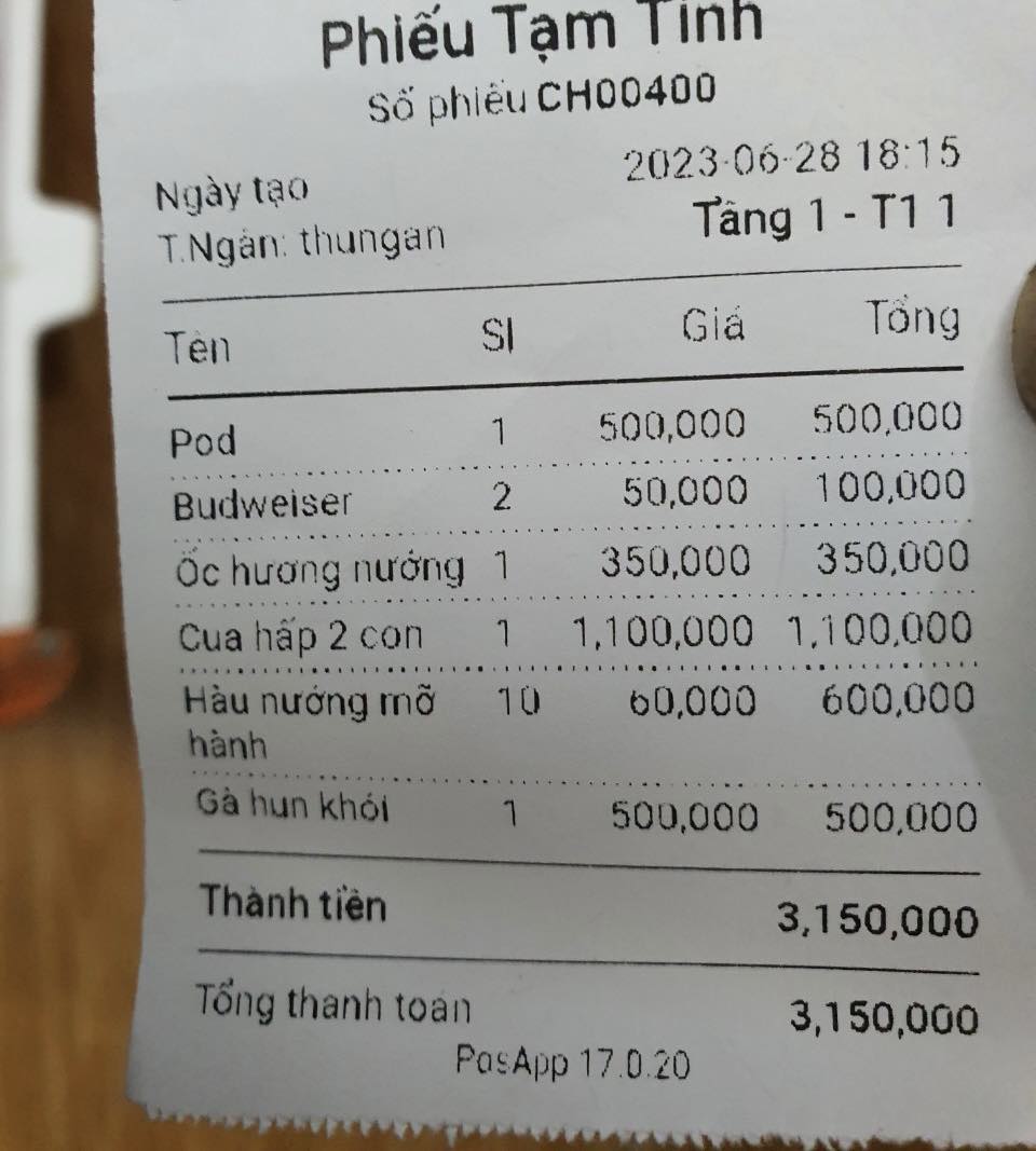 "Mình không để ý để bạn ấy gọi ra theo hoá đơn bên dưới. Mình với bạn ý ăn uống, nói chuyện bình thường, lúc thanh toán bạn ấy xin ra ngoài lấy xe trước. Mình ngồi thanh toán mà khi nhận hoá đơn thấy đắt kinh khủng, 2 con cua hấp 1,1 triệu đồng, hàu nướng 60k/con, gà hun khói 500k. Mình mang 3 triệu mà thiếu phải đi hỏi người nhà chuyển gấp thanh toán. Lúc mình ra gọi bạn kia không được, mình mới nghĩ mình bị lừa nên ấm ức đi về", người này chia sẻ thêm.