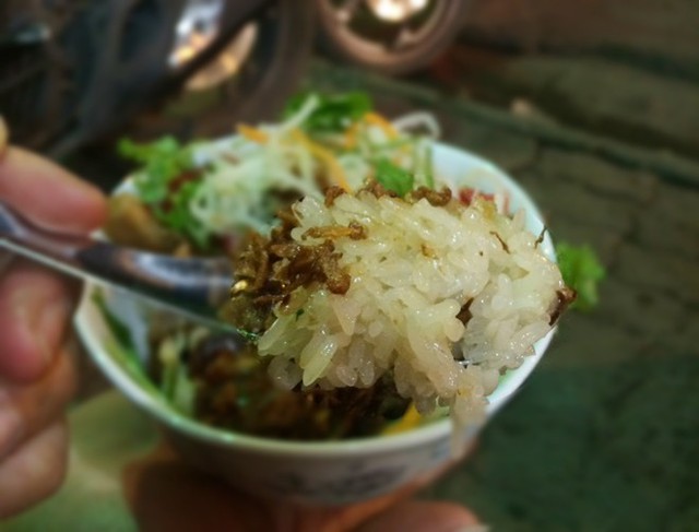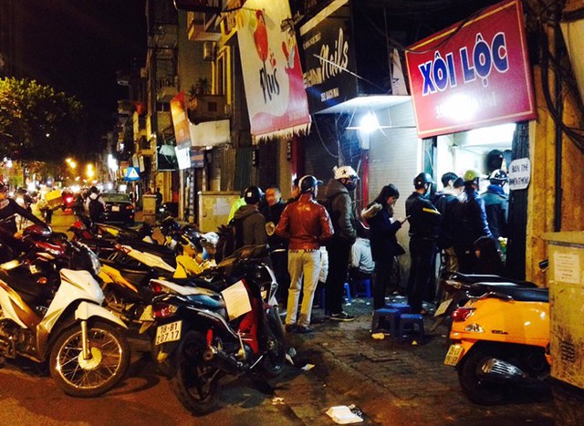 Đó là quán Xôi Lộc nổi tiếng khu này. Quán chỉ mở từ 18h đến rất khuya. Điều thú vị là giờ cao điểm của quán thường là lúc sau 22h. Vào khung giờ ấy, khách phải đứng xếp hàng dài. Đoạn phố cũng trở nên chật chội khi xe máy đỗ tràn đầy lòng đường.