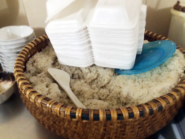 Lượng xôi quán bán mỗi ngày được đong bằng thúng lớn.