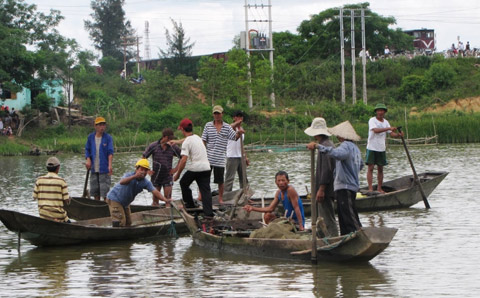 Người dân tìm kiếm thi thể ông Bình, ông Thược. Ảnh: VQ |