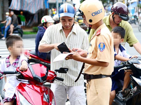 CSGT TPHCM xử phạt người chở trẻ em không đội mũ bảo hiểm.Ảnh: T. Thắng. |