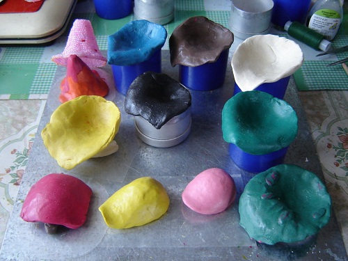 Bước 1: Nặn đất nặn thành hình cánh hoa, độ lớn tùy ý thích của bạn. Phết keo trong lên mặt lồi của cánh hoa.